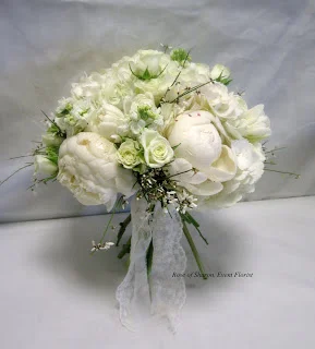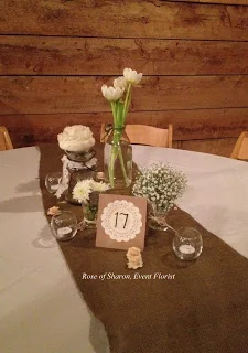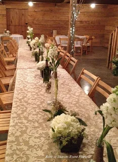 We started 2012 with a beautiful wedding held at Pratt Place Barn. Peonies, Hydrangeas, tulips, roses, wax-flower and baby's breath in rustic containers and vintage jars ... ivory linens with burlap runners...soft, romantic, vintage, BEAUTIFUL! The shop smelled wonderful for days.