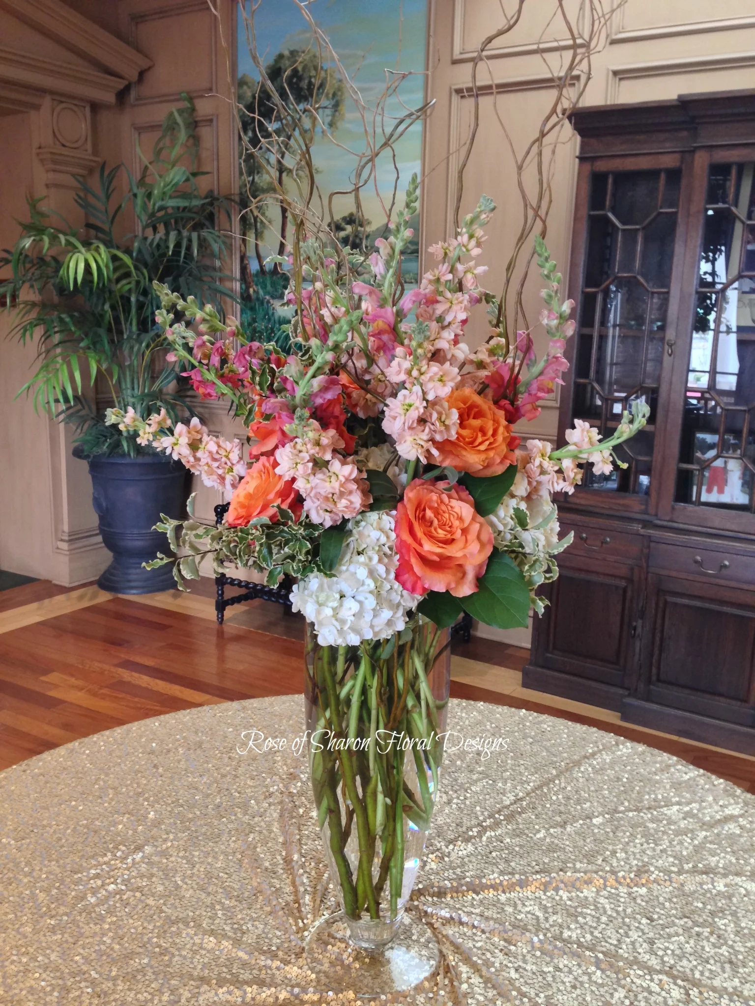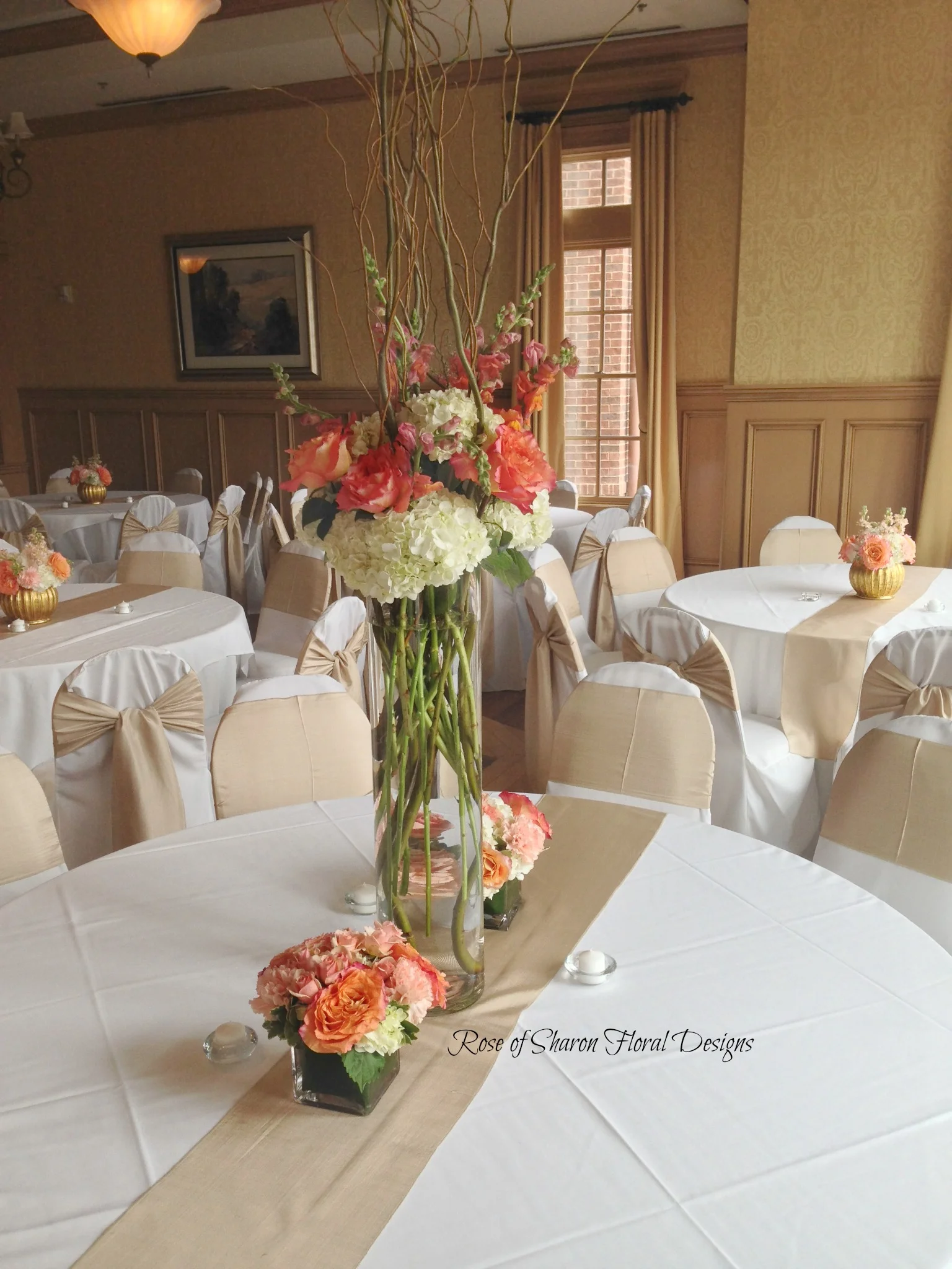 For their reception, Rachel added an extra pop with Free Spirit Garden roses in three different style centerpieces and a magnificent entryway display featuring the Free Spirit, hydrangeas, snap dragons and curly willow. Within the reception hall tables are full of centerpieces, from low arrangements in gold globes to smaller square arrangements to tall cylinder vases that mimic the style of the grand entry display.