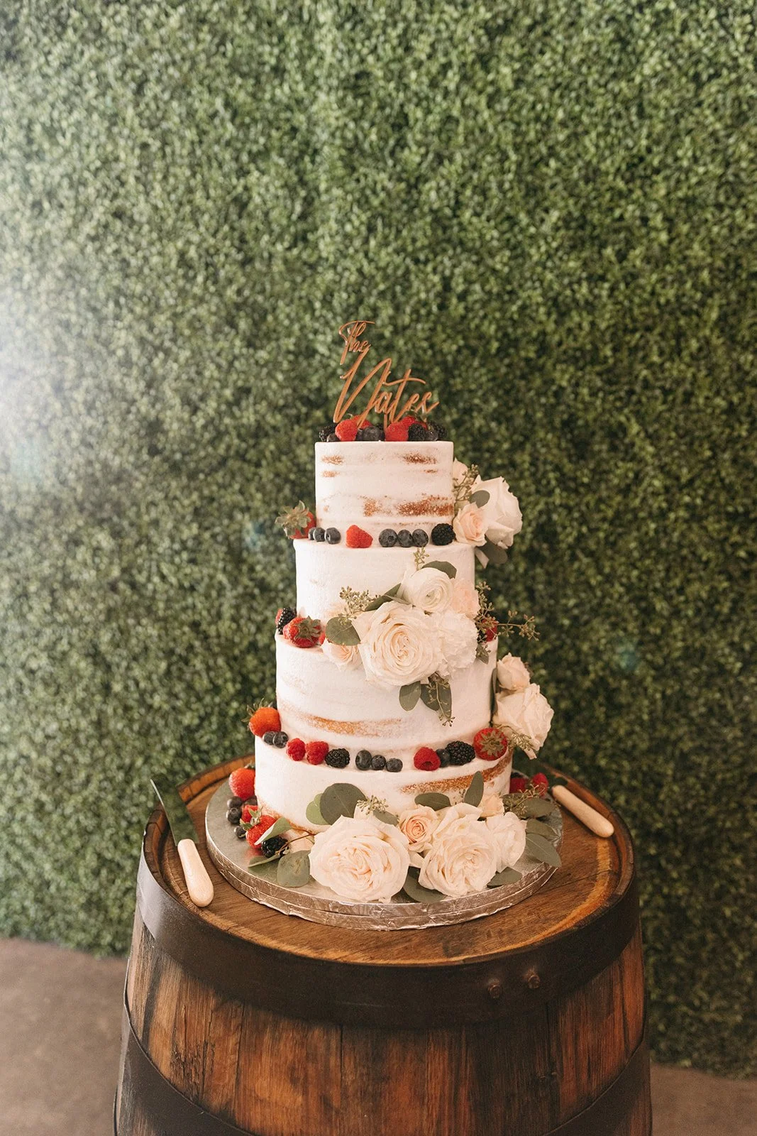 For the reception, we trailed dollar eucaltyptus down the center of the main, long table and accented it with bud vases full of ranunculus and roses. On their circular tables, we alternated between a foliage accented lantern and a cluster of bud vases. Voluminous Garden Rose and ranunculus blooms were the final (figurative) layer of icing on the berry accented cake.