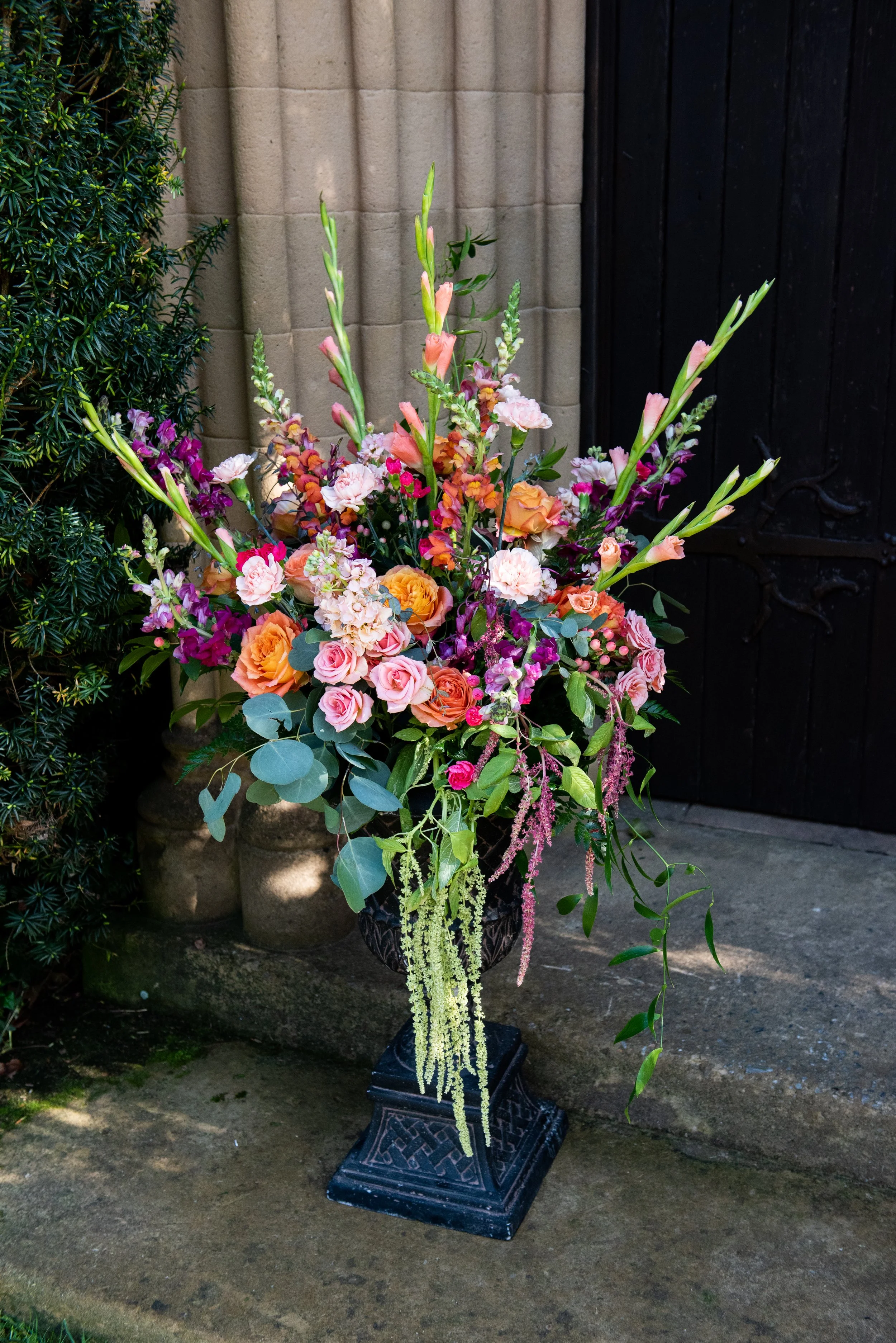 For the ceremony, we designed 2 large, tall arrangements to accent the chapel entryway. Trailing Italian Ruscus and hanging amaranthus, were accented with tall gladiolas, fluffy stock, and dramatic roses of all sizes and colors. I LOVE how they turned out and how they accented the dark door of the chapel.