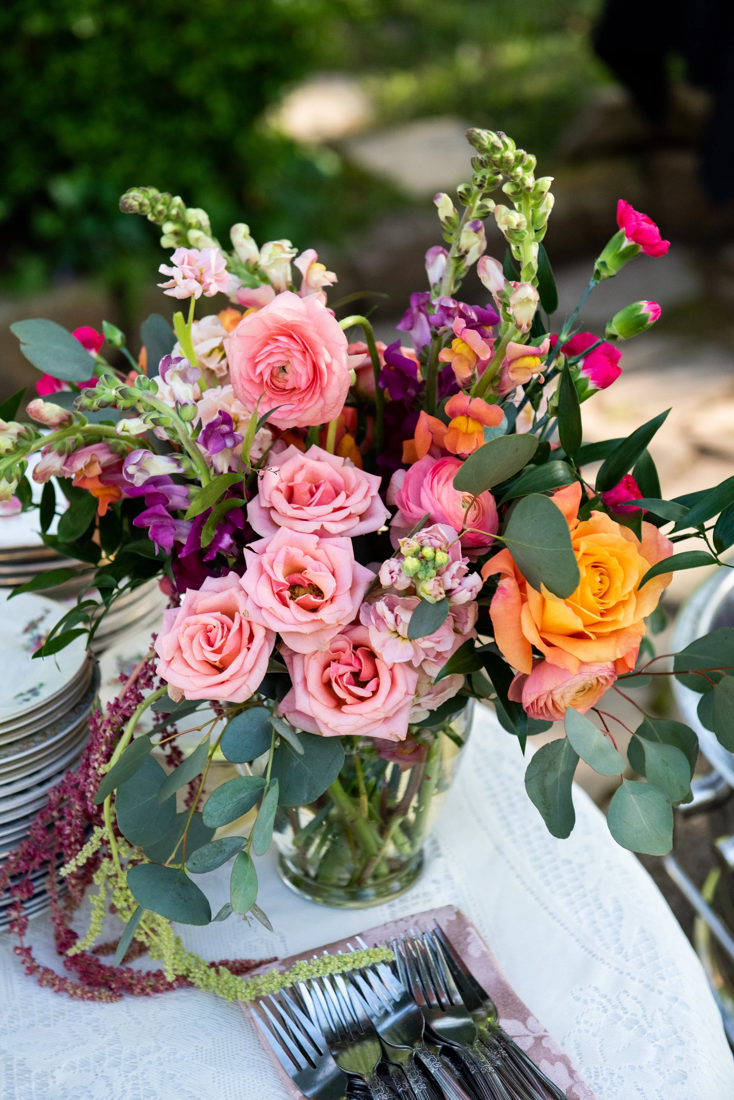 For her bouquet, we used gorgeous Free Spirit Garden Roses, pink ranunculus, hot mink carnations, and purple AND pink stock! The bouquet had so much dimension and texture and was the perfect example of what I call a semi-organic style. For the finishing touch, the groom’s bout featured an ombre pink ranunculus bloom and a pink spray rose bloom.