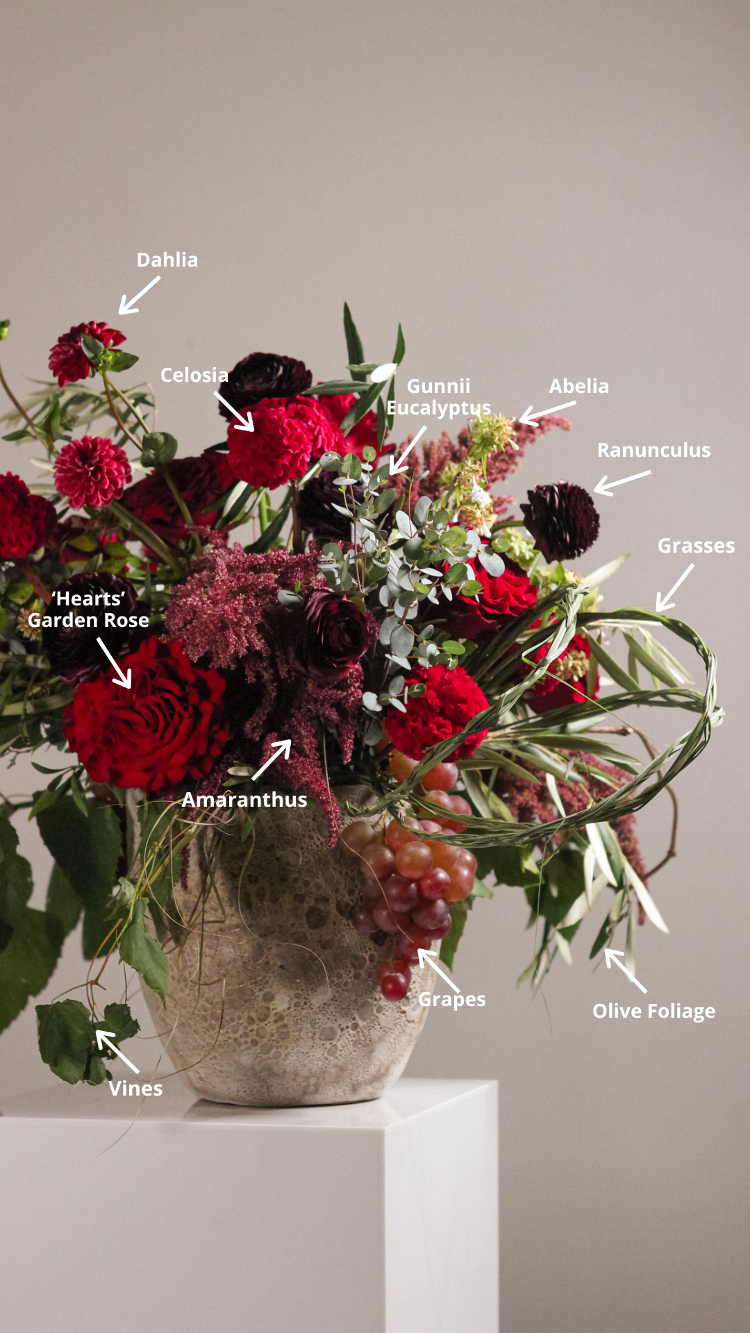 This design blends rich jewel tones with natural textures. We used burgundy roses and deep purple ranunculus, paired with soft olive branches and eucalyptus. Plum amaranthus adds a dramatic cascade, while celosia brings shape and interest. To finish, braided grasses, vines, and clusters of red grapes give a nod to Tuscany’s vineyard charm.