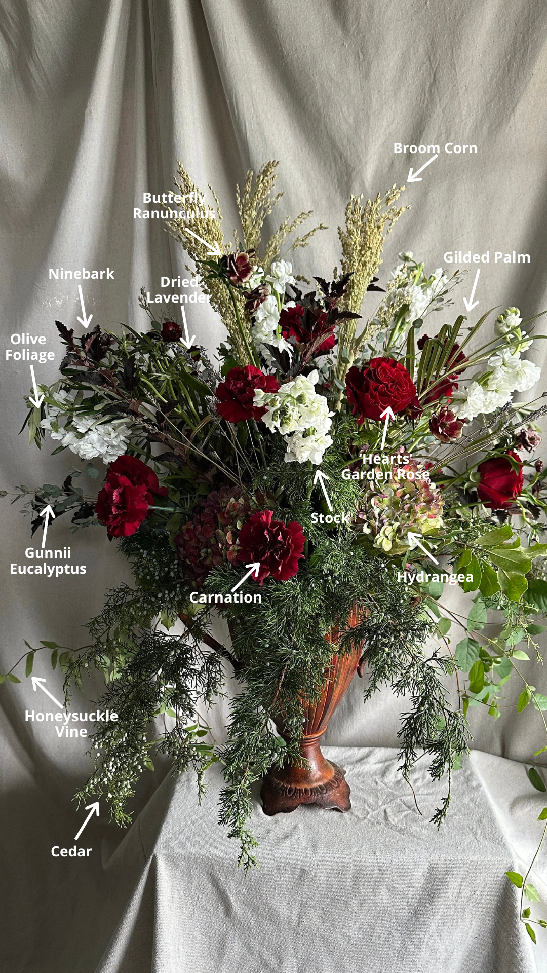The interplay of between strength and delicacy is highlighted by the use of strong branches supporting delicate blooms, including roses, hydrangeas and stock flower.