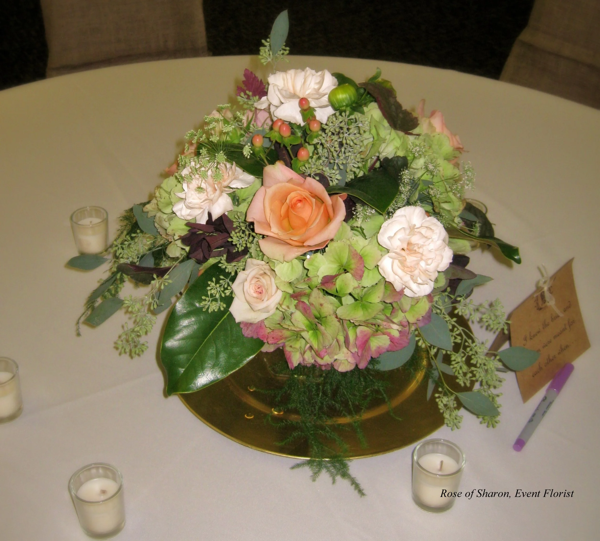 Andria was married on the fall of 2011 and she chose a pastel color palette. Think green hyndrangeas, peach roses, blush carnations, Cafe au Late Dahlias and cream Queen Anne’s Lace. At the time, soft pastels were popular wedding flower colors and I loved the freshness of the peach and green combination Andria chose.