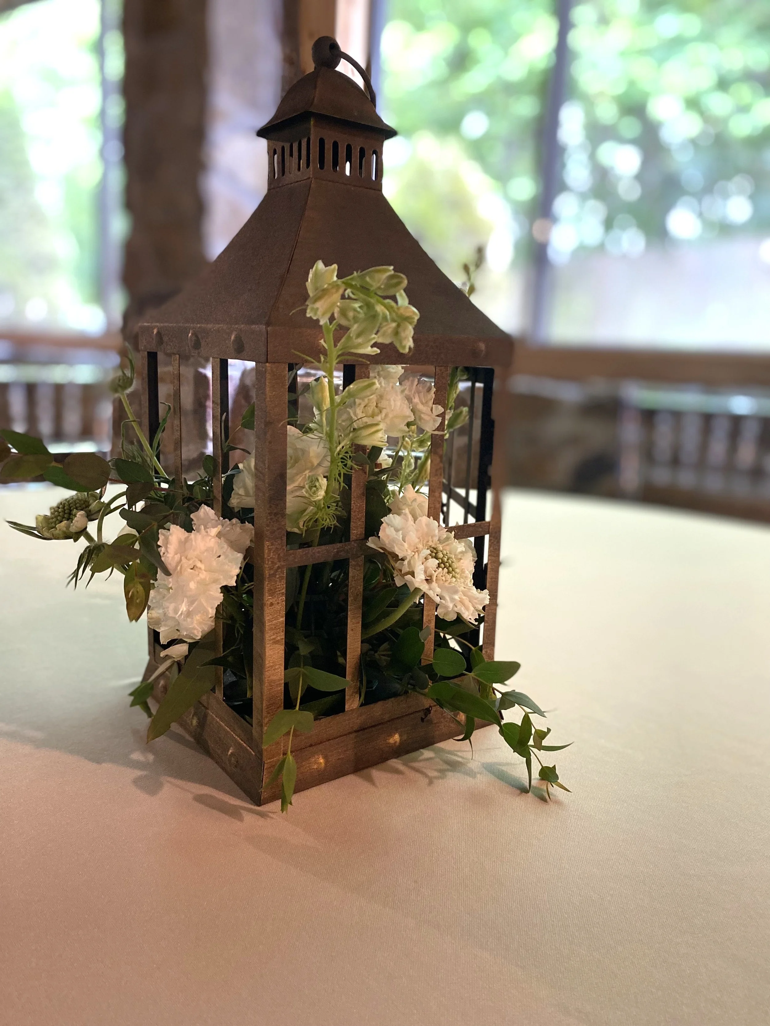 Alyssa was married in the spring of 2021 at Stone Chapel at MattLane Farm. She chose a white & green palette which has always been popular and classic with my clients, but a fluffy, delicate flower style started coming into fashion during this time period. Many-petaled ranunculus and delicate scabiosa were front and center in her bouquet while lush green Italian Ruscus and fluffy stock shone in her centerpieces.